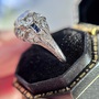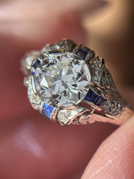 This beautiful ring gracefully bridges the transition from the Edwardian era (1901–1919) into the early Art Deco period (1920s), blending the light, airy femininity of Edwardian design with the emerging use of colored gemstones and bolder geometric influence that defined Art Deco.