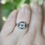 At the center, a bright and sparkling GIA-certified 1.10 carat I color, SI1 natural antique diamond is set, surrounded by twinkling accent diamonds and custom french-cut sapphire accents, arranged in an elegant floral motif within a finely crafted platinum mount. In the gallery delicate petals extend from a diamond accent, on the shoulders a finely engraved flower climbs - we adore the details of this beautiful ring.