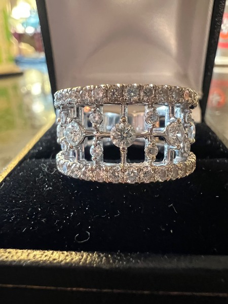 I have had this Kwiat ring for a while, and it’s one of the most blingy and sparkly piece of jewelry I have ever owned. But I *think* I am ready to let it go. It has always been loose on me. Now my finger size has changed so it is every looser! I never get around to sizing things either. It has almost 2 carats of beautiful stones and is 10 grams of 18k gold (which, in today’s gold prices – egad). So I am offering it up for sale here. It is a size 6 on my mandrel (see photos) but since it is a thicker band I believe would be comfy on 5.75. It is approx 11.8mm wide at the widest part and 6.8mm at the smallest (in the back). This ring is just full of fire and sparkle. It is amazing and retails for over 8k so I am offering it for a very competitive price.