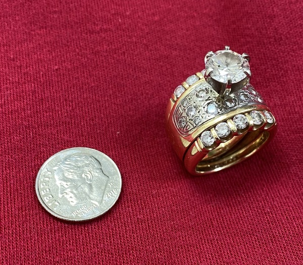 The ring is 14k yellow gold and has a total weight of 4.18 carats. It has a wide tapered band raised with pave diamonds and a raised center diamond. The outside bands are soldered to the center band and each has five vertical diamonds. The center band is 11.8 mm wide in the center and tapers to 4.8 mm wide in the back. The center diamond is set in a six prong white gold head. There are twelve diamonds pave set in the center band; six of them are round brilliant-cut and six are round single-cut diamonds. The pave diamonds are set in a white gold plate. There is a flexible yellow gold ring guard inside the shank.