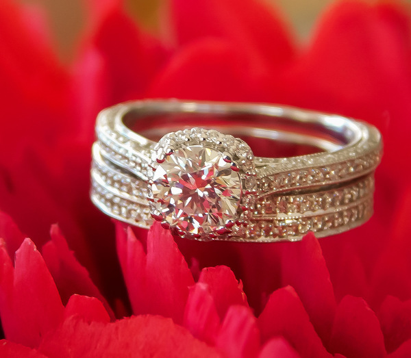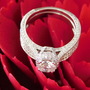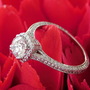 A One Carat Devotion Cut Diamond is surrounded on all sides by brilliant mele diamonds. This ring simply sparkles from every angle!
