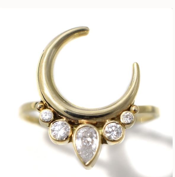 I am selling a never-worn ring purchased from angel alchemy jewelry. This crescent moon dreamcatcher ring is done in solid 14k yellow gold. The diamonds are clear and sparkly. It’s a size 7.25, but can be resized by any local jeweler.