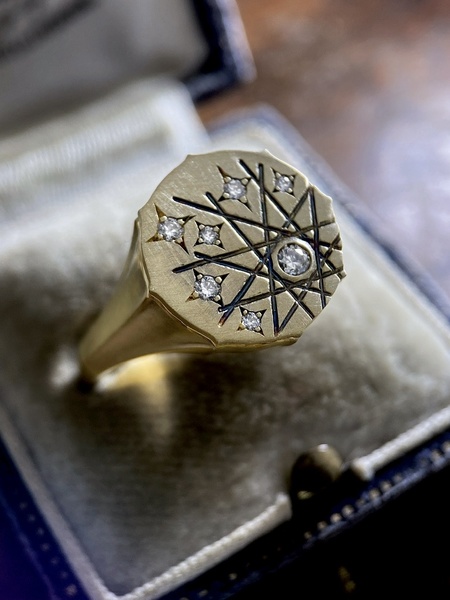 Uniquely stunning signet style ring that I designed & crafted prior to Christmas though when I unintentionally created two, instead of scrapping one, I had it completed. I adore the geometric/abstract celestial theme on the Juno shaped face, and the weight of this piece is awesome.