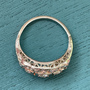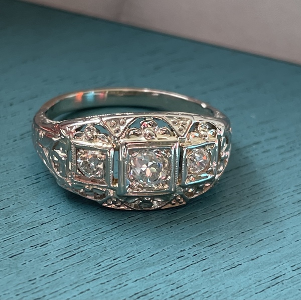 Reduced! A beautiful vintage 18K White Gold and diamond 3 stone ring featuring near colorless, SI diamonds with a total diamond weight of 0.36ct. The diamonds are old cuts with small tables and high crowns. The ring is approximately 9.5mm wide at its widest point and is between a ring size 5 - 5.25. I purchased the ring from The RealReal and they had tested the ring for 18K purity since it is not stamped.