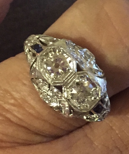 Reduction! If you love vintage, antique & art deco rings, this is the ONE! Twin Old European Cut diamonds set in platinum-Hallmarked, with smaller diamonds & royal blue sapphires. Beautiful milgraine, filigree and open work detailing. The OEC diamonds total .75 carats, smaller diamonds .40cwt, sapphires .15cwt. One of the OEC diamonds has a larger culet than the other. Can see in 1st pic. Face of ring is 12mm wide (north south). Weighs 5.3 grams. What a history with this ring!
