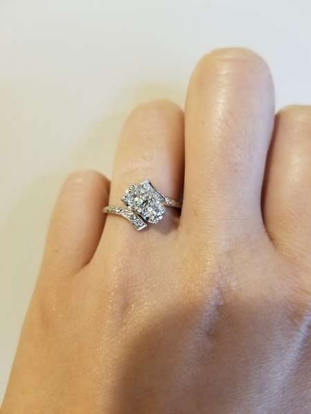 Romantic Toi et Moi Ring featuring 2 OEC diamonds at the center, approx. 3.5 and 4mm each. They are flanked by 6 oec diamonds surrounding it, 3 on each side.