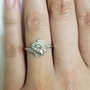 Total diamond weight is over .5 carats. Diamonds are eye clean (possibly SI in clarity) and has quite the fire and sparkle. The larger center diamond does look warmer vs the smaller center diamond in some lighting, but this is definitely not obvious and does not stand out when worn. I just want to mention it to be truly honest in my observation. The illusion setting is well done and adds to the charm and presence of the ring.