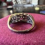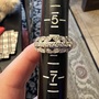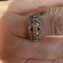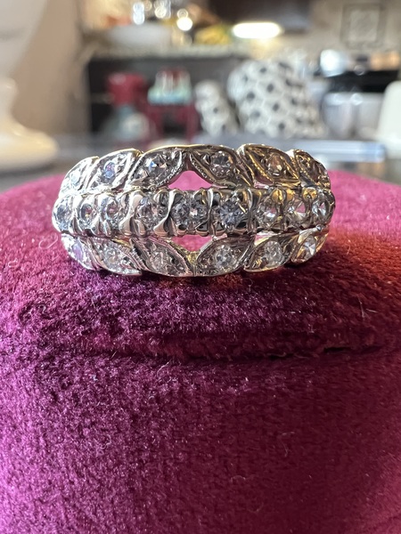 This is such a beautiful and unique ring. It is 4 g of 14 karat white gold and a really beautiful floral vine design. The middle row has brilliant diamonds and the rest are single cut diamonds. The size is between a 5.5 or 5.75 depending on the size it is on.
