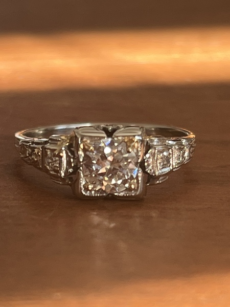 Beautiful vintage, 14 K white gold ring with a Centre 0.48 carat old European cut diamond. J/K color, SI1 clarity. Has 4 smaller diamonds in the band. Currently a size 6.5 and sizable. The band is not stamped 14 K as it was reshanked, but it tests at such.