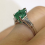 1.77 ct Colombian Emerald and baguette diamond platinum ring. Emerald is 9mm x 6mm, vibrant blue green in color, a few inclusions, natural and not enhanced. Diamonds are 0.20 each- E-F color, VVS clarity. Ring is made of solid platinum, acid tested and guaranteed. Ring is is 3.75, if mounds are removed it is a size 4 and sizesble. Ring can be sized for an extra fee of $16 per each size. Shipping $20 US.