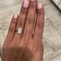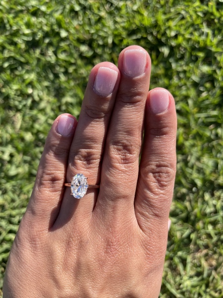 DEF colorless 11.5x7.5mm brilliant oval, with lab diamond melee on hidden halo, 14k rose gold cathedral setting. Size 6.5. Purchased from Starsgem and only worn once. Selling because I found that I prefer a rounder oval.