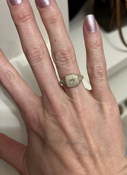Excellent condition. Had sized from 6 to 4.75. Listed as .52 ctw pave diamonds and .05 baguette diamonds. 14k Yellow gold. Final sale. No returns. PayPal friends and family or add 3%