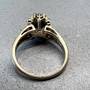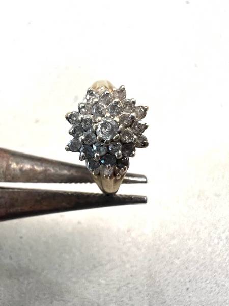 Lady's 14 karat yellow gold cocktail ring which holds twenty-five round brilliant cut diamonds in a snowflake cluster. The diamonds weigh an estimated 1/2 carat together and are (I1-I2) clarity and (I-J) color; the ring is in excellent condition and weighs 5.3 grams.