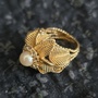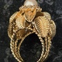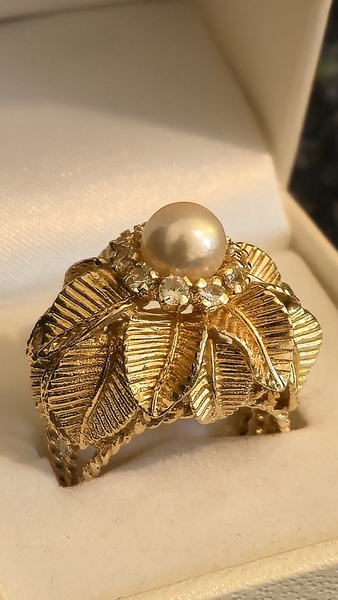 14k Gold Ring with floral/leaf motif, topped with pearl and a ring of .4CTW clear sapphires. Heavy rope shank setting, 14k stamp has faded from past wear. A whimsical and enchanting find fit for any femme or fairyfolk fair.