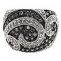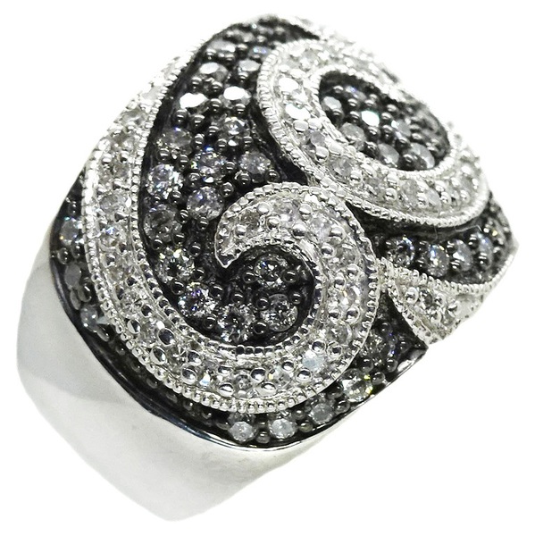 Beautiful natural gray diamonds that combine with white diamonds in fine jewelry to stunning effect. Gorgeous wide domed cocktail ring in sterling silver with 1ct natural gray and white diamonds in a swirl design. White diamonds are H-I color and I1-I2 clarity. Comes with IGI certificate of authenticity. Inside band is marked 925 with the maker’s mark. Size 6.5, weighs 8.85 grams. Ring measures about 16mm wide in front, narrowing to about 6mm in back. New condition. All stones present. Very light patina.