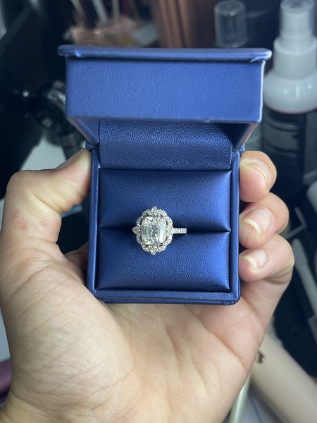 2ct radiant cut antique style moissanite ring 14K white gold, size 4.5 from Moissanite Co. (have paper work, 2 boxes and jewelry bag) paid $1,800 only a few months ago. This ring is absolutely beautiful and worn only a few times-my hands are just very tiny and I need something smaller to not overpower my finger. Please let me know if you have any questions or want to make an offer! :)