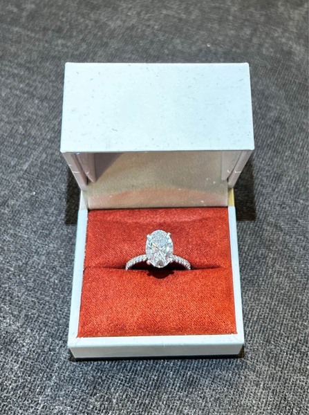 3 1/3 carat, oval lab-grown diamond draping hidden halo engagement ring, 14 karat white gold, FG, VS2+, certified by International Gemological Institute, 3.06 carat center diamond, size 6.5. Purchased for more than $7,500. All paperwork included.