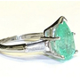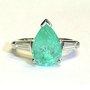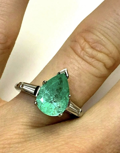 Lovely 4.6 ct Colombian Emerald set in solid stamped platinum. Emerald is natural and light to medium spring green in color. Measurements are 12mm x 8mm. Visible inclusions that are quite lovely, stone emits a strong glow. Baguette diamonds are 0.20 carats each- E color and VVS clarity. Ring size 5.5. Shipping is $20 US.