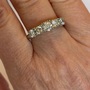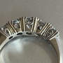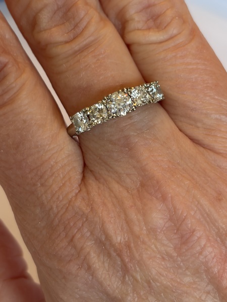Vintage 18k gold diamond band featuring a central Old European Cut diamond measuring approximately 4.5 mm, flanked by four modern round brilliant diamonds measuring approximately 3.1 mm each. The stones are set in an elegant crown-style gallery with open backs allowing maximum light return. Setting height in middle: 6mm