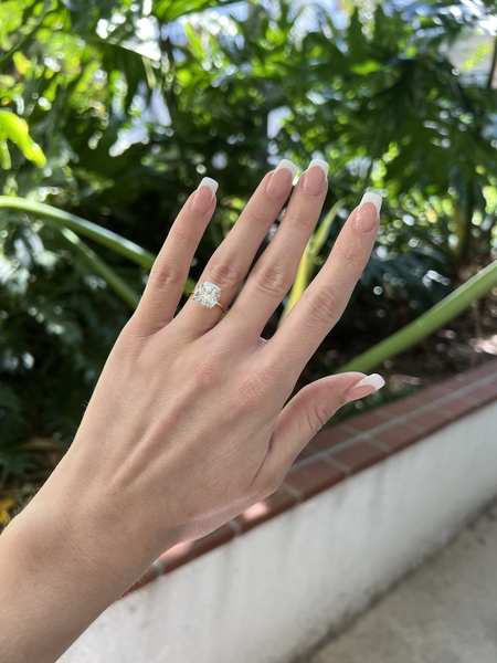 -9.5mm moissanite ring in 18k champagne gold (beautiful blend of gold & rose gold). Cushion cut solitaire stone with hidden halo. Ring was purchased as size 4.5 and taken down to a size 4 by the company it was purchased from (screenshot shows $35 return shipping when they sent it back after sizing it).