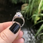 Stunning antique engagement ring. Center stone is a unique cut- a cross between a French cut and Cuboid Cut diamond. The center stone is 1.51 carats, F in color, and I1 clarity. There is a carbon inclusion in the corner. Dimensions are 5.6mm and 5.3mm. The diamond is not certified, but can be for an additional $150. The setting is made of platinum, and has synthetic sapphires and Old Mine Cut diamonds. Marked platinum. Shipping is $20 US. Video can be provided upon request.
