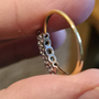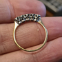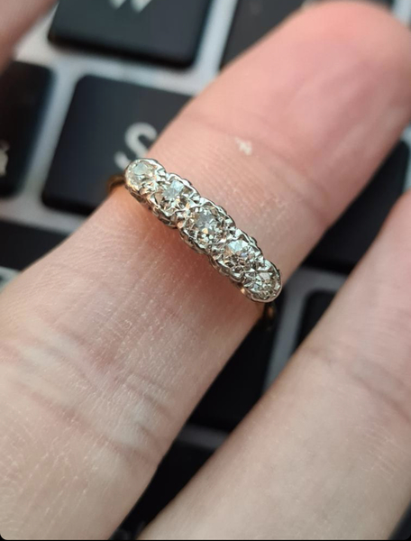 Antique 5 European cut diamonds set in platinum with 18ct yellow gold band. Si clarity, i/j colour and 0.35ct total. Old European cut diamonds with no damage and all original with original shank. Can be sized up or down. It’s very dainty and oh-so-sparkly! These diamonds have a lot of fire!