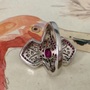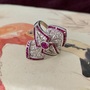 Art Deco reproduction cocktail ring with natural diamonds and pinkish-red rubies, set in 18k white gold. Weight is 6.14g.