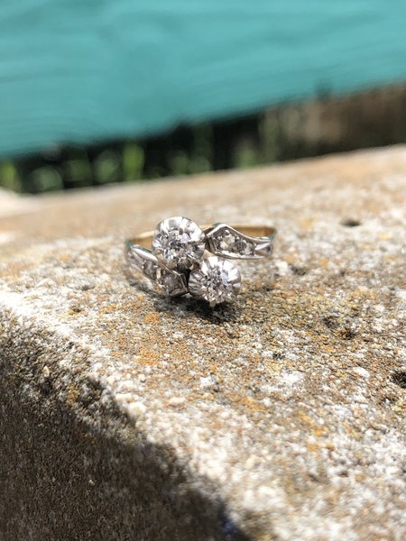 Sweet antique Toi et Moi ring. Size 6.75. Diamonds are set in a platinum top and 18K yellow gold shank (acid tested.). The two center diamonds are 0.15 and 0.17 carats- Old Mine cut, VVS, and G color. Rose Cut diamonds are on the shank of the ring. A total carat weight of 0.40-0.45. Shipping is $15 US. I am @mollie_francine on Instagram.