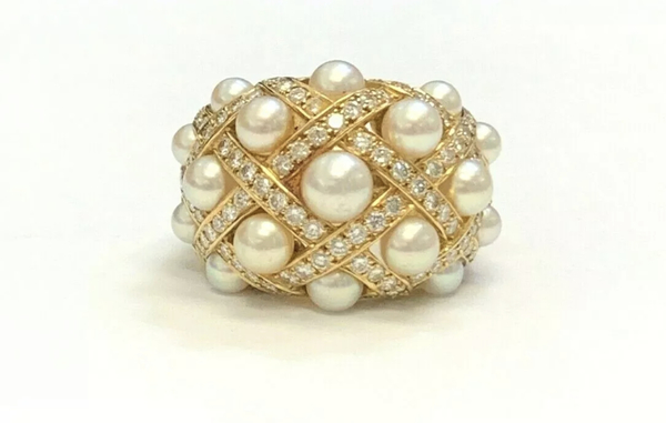 Chanel 18K yellow gold Matelasse diamond and pearl ring. Size 5.25. 17.65 grams. Marked Chanel, authentic and guaranteed. 1.25 ctw of white VVS diamonds. Has not been polished, but can be polished if desired before shipping. Shipping is $20 US. I am @mollie_francine on Instagram.