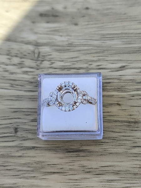 Very well made 14k wg semi-mount with nice diamonds. Setting is size 6.75. Setting fits 7mm round stone.
