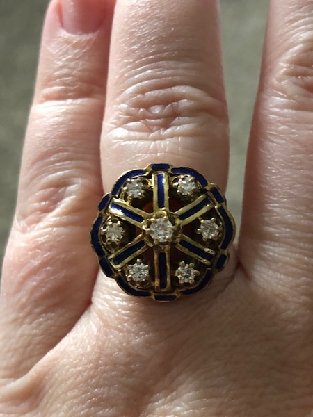 Stunning diamond and blue enamel cocktail ring set in 14k yellow gold size 6 and sizable. Diamonds measure approximately 2.5mm (approx. .29ctw). Shipping included within the continental United States. Final Sale.