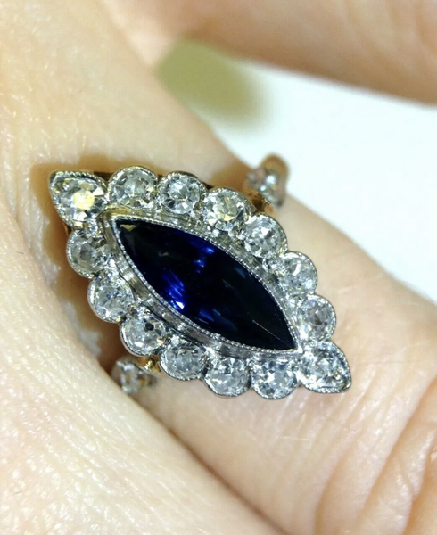 Antique Edwardian Marquise Cut sapphire and diamond ring. Central natural sapphire weighing 0.70 carats. Surrounded by old mine cut diamonds, E in color and SI2 clarity. Ring is 17mm x 4mm. Acid tested platinum top with 18K yellow gold shank. Size 5. Shipping is $15 US.