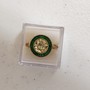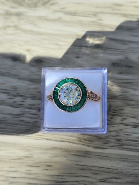 Pretty Target ring with earth-mined emeralds. Center stone is a light yellow well-cut moissanite that looks like a light yellow diamond. Setting purchased from Ivy and Rose on Etsy. Center stone is 7.5mm. Video available upon request. Ring is size 7 1/4.