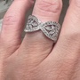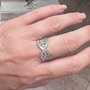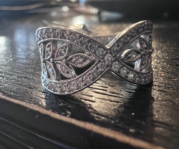 This ring is over 6g of 14k white gold and has about 35pts of pave diamonds. I love the design in the floral leaf pattern. It's just too loose for ring finger and too tight for middle for me; I love the look on both fingers!