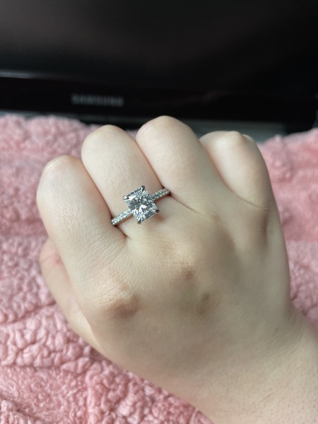 Item Details: 2.5ct Radiant cut Pave band Forever One moissanite ring, platinum, size 9 (originally size 8, but brought to a jeweler to size up one)