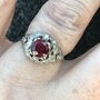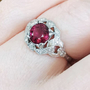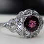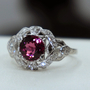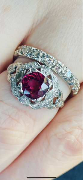 Gorgeous hand cast art deco platinum ring set with diamonds and a 7mm glowing red garnet center stone.