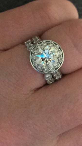 1.81 ct Round brilliant center diamond, lab created, and additional diamond melee. I don't have the paperwork any longer, but I think it is a J? I have adjusted the price to reflect the lack of paperwork