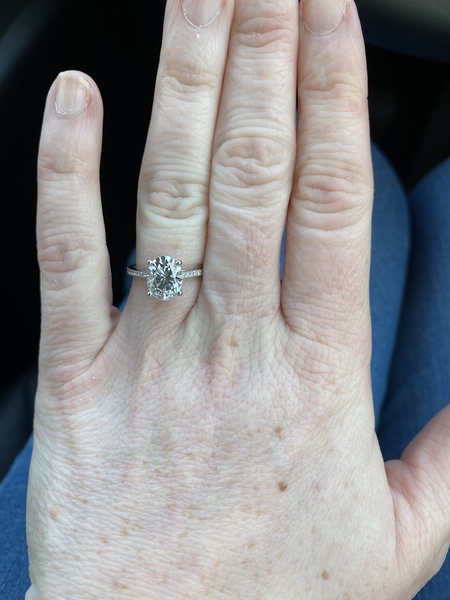Charles colvard 9x7mm oval stone, with pave moissanites that go 3/4 around a pave band. In Australia, happy to ship if shipping is paid for.