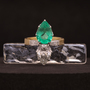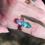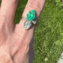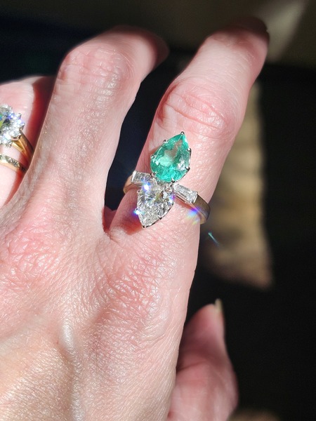 Made by David Klass solid 18k yellow gold and platinum weighing 7.3 grams, set with .35 G color VS lab bullets, a 2.51 Natural emerald pear and a 2.07 E color VS1 pear lab diamond IGI LG551274285. Emerald is from JR Columbian Emeralds (they’re pretty popular vendor) and they send their report 2.51 ct , Muzo Columbia 11.44 x 8.03 x 5.63 transparent, Treatment: Natural, Oiling. I LOVE the color of this emerald it glows. This is not a $10,000 emerald, it’s a $4750 emerald I paid retail for and I am now discounting, so no, it aint perfect! You want perfect, you’ll pay $10k plus. I thought it was gorgeous for the price. I paid all in for the emerald, lab pear and setting $7,500, selling for $3,950