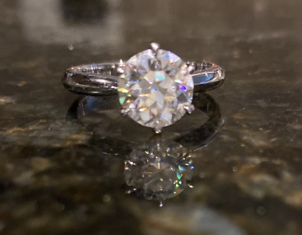 14k white gold size 7 oec round moissanite ring from Starsgem. It is 8mm/2ct and gh color. Serious inquires only please. No returns or exchanges as I am a private seller. Free shipping, thanks