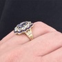 In 18K yellow gold, the ring features a super fiery Old Mine Cut Diamond Halo around a lovely blue sapphire. Deep blue enamel decorates the outer border, as well as the leafy designed shoulders. This ring has a major presence and finger coverage, with tremendous sparkle. I’m conservatively estimating the carat weight at around 3.55carats, as it’s not easy to get really precise depth measurements of the stones.