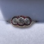 Three sparkly old European cut diamonds with the largest measuring about 3mm and the two smaller around 2mm surrounded by a halo of rubies. The bezel is worn in spots and there is one pretty damaged ruby but the diamonds are gorgeous, some of the most sparkly I have seen with high crowns. There are two rose cut diamonds set into each shoulder 14k gold band size 6 and sizable.