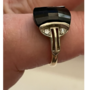 This art deco onyx and diamond ring is stamped 14 K with a makers mark. It has a faceted checkerboard black Onyx in a great shape. The band is 14 karat yellow gold, and the accents are 14 karat white gold on the shoulders and the basil of the onyx. Two diamonds are on each side And it is really low set to the finger. It’s a really cool piece. I haven’t ever seen one quite like it. Everything looks to be original. It’s in between a 6.25 & 6.5 on my ring mandrel, so about 6.33.