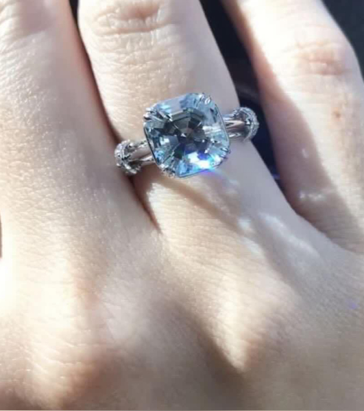 A beautiful aqua set in 18K whitegold and near colourless sparkly side diamonds. This gorgeous untreated aqua is a mesmerising light medium blue cut in Peter’s Asscher cut. His incredible faceting brought so much life and brilliance in this stone! It enjoys the sunlight, shooting off flashes of light!
