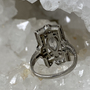 Absolutely stunning Art Deco dinner ring. Featuring center stone is a 8mm x 4 mm Marquise cut diamond. Surrounded by 26 old mine cut diamonds, and four 1 mm x 2 mm baguette cut emeralds. Diamond weight is approximately 1 carat total. The center Marquise is approximately 0.50 carats. Diamond color is F and clarity is VS. Set in platinum. Diameter of the ring is 21mm x 11mm. Size 4.5. Shipping included if located in the US.