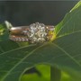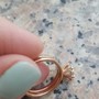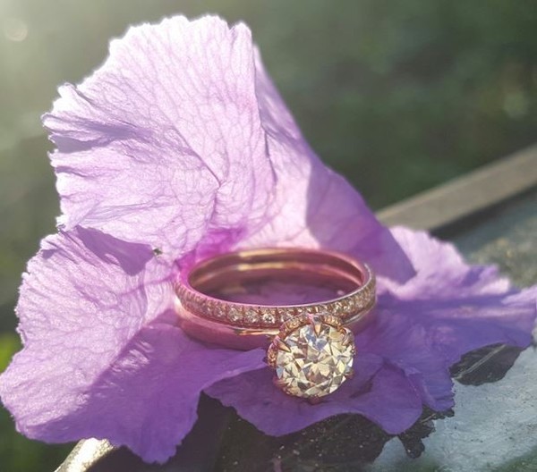This beautiful solitaire features a chunky 6.5 mm Classic OEC moissanite securely set by 6 claw prongs into a delicate but solid, 14K rose gold miligrained petal basket. I do not have the original ppw but it was made by David Klass and his stamp is visible on the inside of the ring. Soldered to the solitaire is a solid 14K rose gold half-eternity band with .19ctw G, VS diamonds.