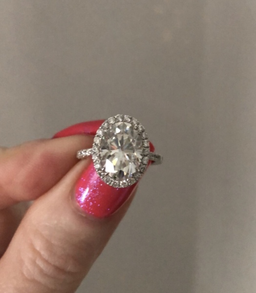 This is a Beautiful 18kt white gold Oval Moissanite ( New Moissanite material with NO funky undertones) and Diamond halo ring ..