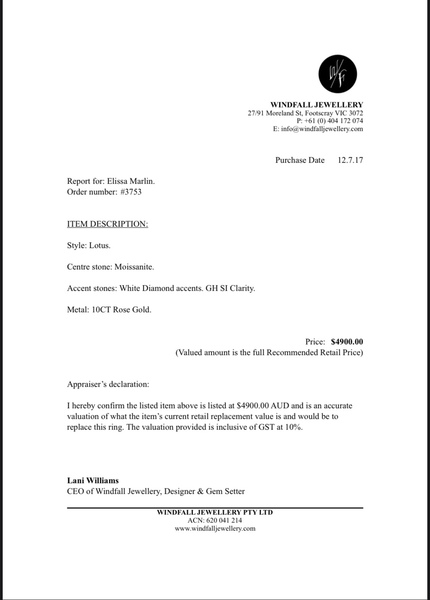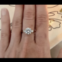 Beautiful engagement ring. Setting is 10ct Rose gold, in a “lotus” style, featuring detailed metalwork around the centre stone. The centre stone is 3mm Moissanite, with 1mm natural diamond accent stones, GH SI clarity. The ring was originally purchased in 2017, but the entire band and accent stones were replaced in 2021 with new. No visible damage to band or stones. Size L