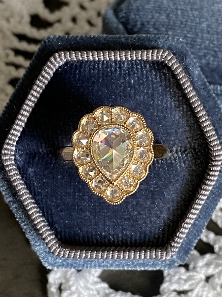 This ring is from JuliaB so you know her craftsmanship is top notch. It is currently being sold on her Etsy for more than twice the amount. It consists of 7x9mm pear rose-cut Classique Moissaniteâ„¢ in the center, surrounded by thirteen 2.5mm rose cuts, set in 18kt (not 14kt) yellow gold bezels with beautiful fine hand milgrain. It is solid ring with a solid 3mm thick band. Finger coverage of 14mm across and 17mm vertically. Another one of my impulse purchase which I never wear which means still bright and shiny. It is currently at size 7 and has never been resized.