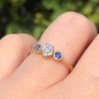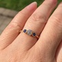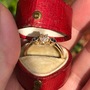 I’m torn over letting this one go, but I must make room for my incoming projects! This beautiful .58ct OMC is flanked by two, 3.5mm natural blue sapphires. The diamond measures 5.09 x 4.65mm and I would conservatively say it’s J/K in color and eye-clean, SI clarity. The ring is 14k antique gold (DKs special yellow gold color blend) and weighs 2.64g.